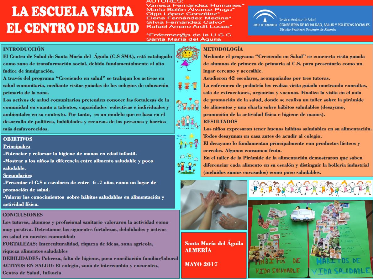 En el centro de salud de Santa María del Águila (catalogado como zona de transformación social, debido principalmente al alto índice de inmigración) se trabajan los activos en salud comunitarios, entre otras actividades, a través de visitas guiadas de los colegios de educación primaria adscritos al programa “Creciendo en salud”. El objetivo de la visita es promover hábitos saludables, reforzando especialmente la higiene de manos. Un Activo de Salud se puede definir como cualquier factor o recurso que potencie la capacidad de los individuos, de las comunidades y de las poblaciones para mantener la salud y el bienestar (Morgan A. & Sigilo E. 2007, Morgan A. Davis M.& Ziglio, E. 2010). Los activos de salud comunitarios pretenden conocer las fortalezas de la comunidad en cuanto a talentos, capacidades colectivas e individuales y ambientales en su contexto. Por tanto, es un modelo que se basa en el desarrollo de políticas, habilidades y recursos de las personas y barrios más desfavorecidos.